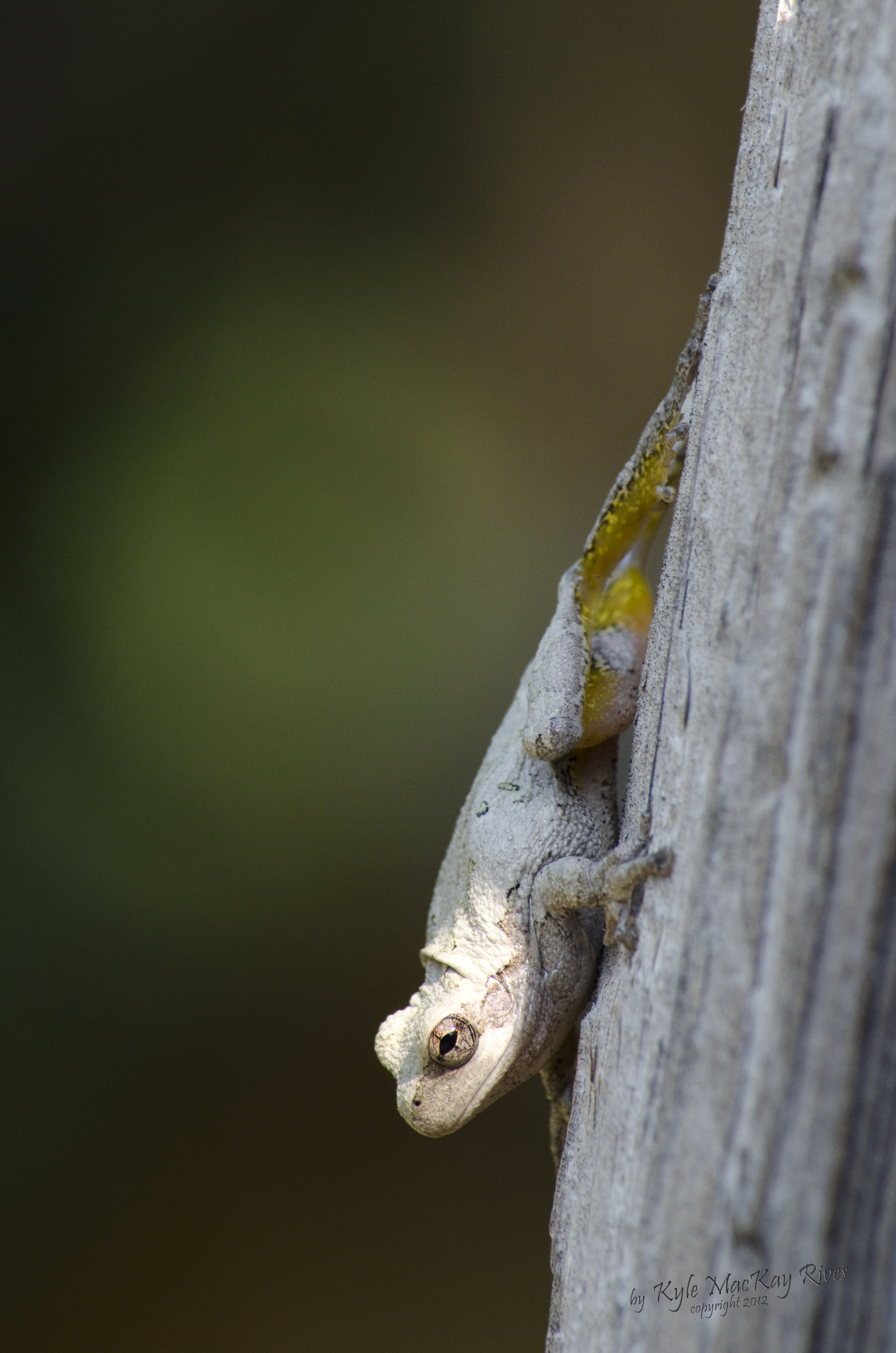 A gray tree frog. His color blended perfectly with the electric pole he was on, even to the green, speckled areas resembling moss or lichen. He froze and stared at me, hoping I didn’t really see him. He crept downward, easing a leg forward, pausing, then slowly moving his body to catch up. This was great for me, as it put his head in the sun! Finally he decided I was showing too much interest and he was close enough to his intended hiding spot, so he hurried into a crevice where I could not get at him.