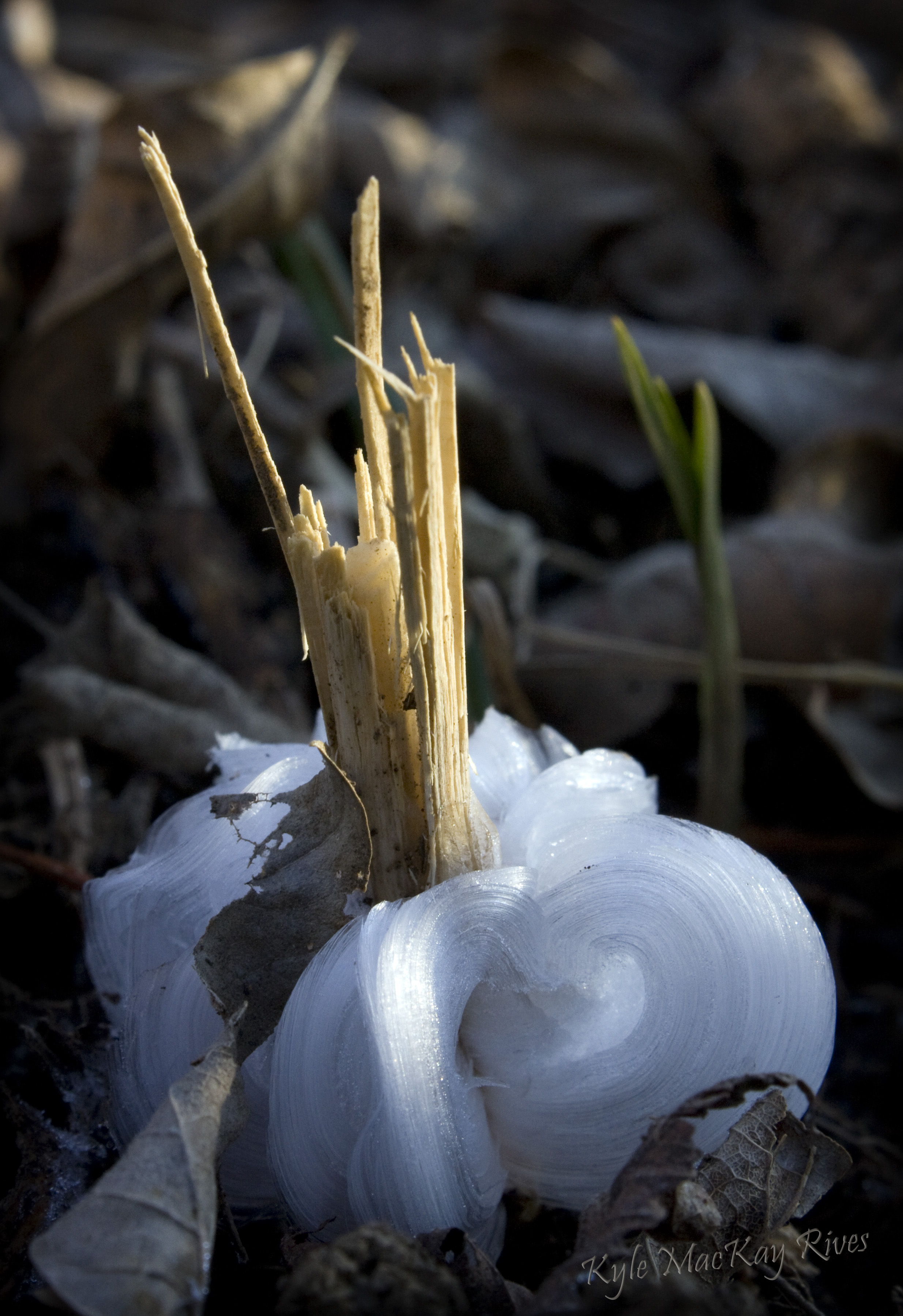 Inspired by my friend Travis’ success just Googling the word or phrase that comes to mind, I tried typing frost flower in the search field… Guess what? These structures are commonly referred to as – frost flowers! They also have a scientific name, apparently: Crystallofolia. This website was particularly detailed: http://w3.biosci.utexas.edu/prc/VEVI3/crystallofolia.html