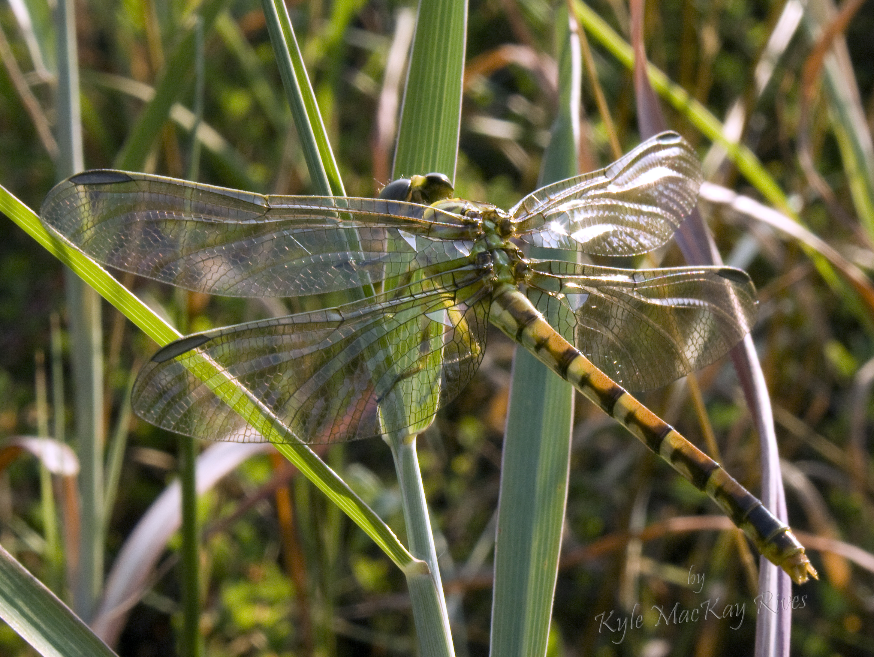 In another flashback to Summer of 2011, we see a perfect jewel of a dragonfly reflecting light off his (her?) faceted wings, its translucent abdomen glowing green, orange, and black. Even at rest it looks in motion with iridescent gleams of light flashing off the far wing.