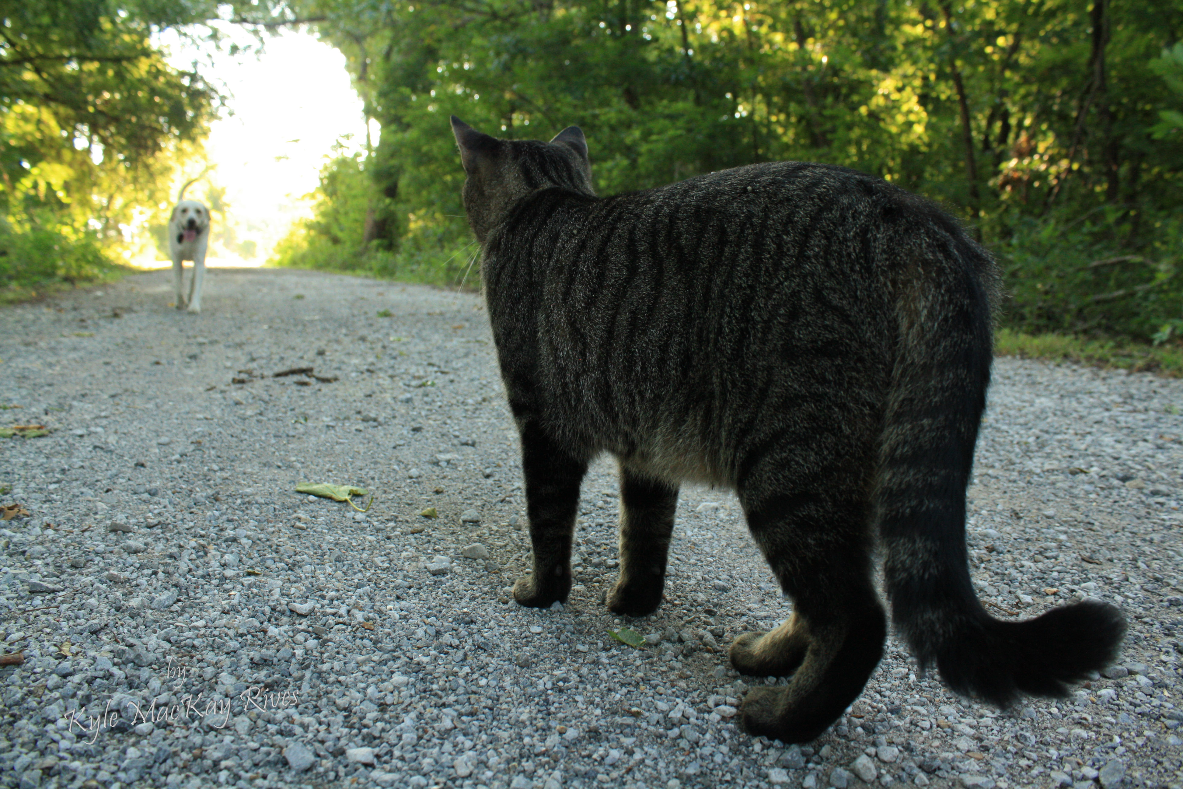 Tiger stares at Zookie. Is he daring her to just try and chase him? Or is he measuring the distance between them, estimating her rate of speed, and calculating how long it will take him to get to a tree? Actually, they get along great, and Zookie only chases Tiger if he runs. And he rarely runs.