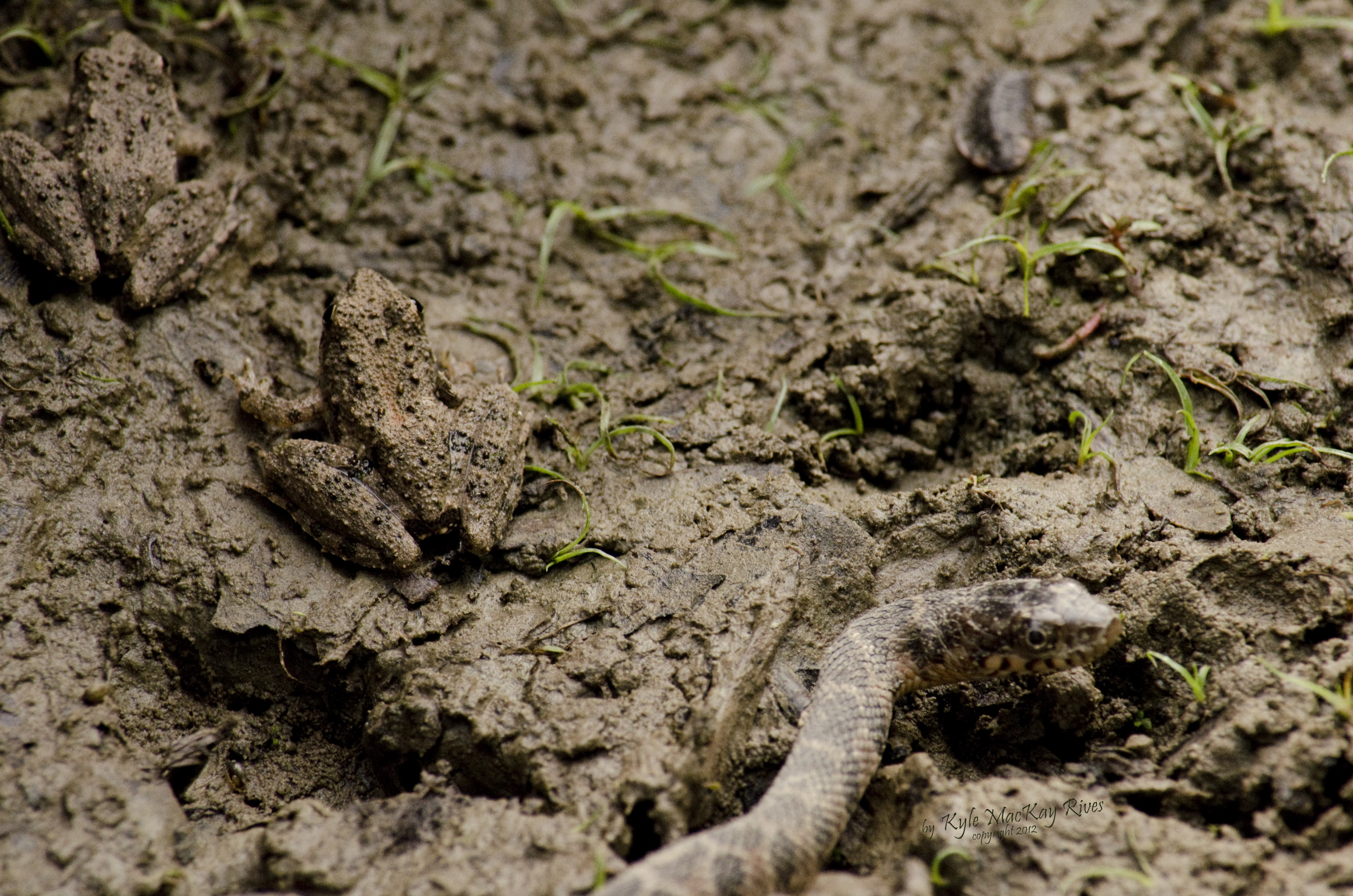 A small snake was revealed. He held very still while I tried to ease closer. My movements startled two toads, which leaped over the snake… The snake was more concerned with hiding from me than with finding breakfast, so nothing happened. All remained very still.